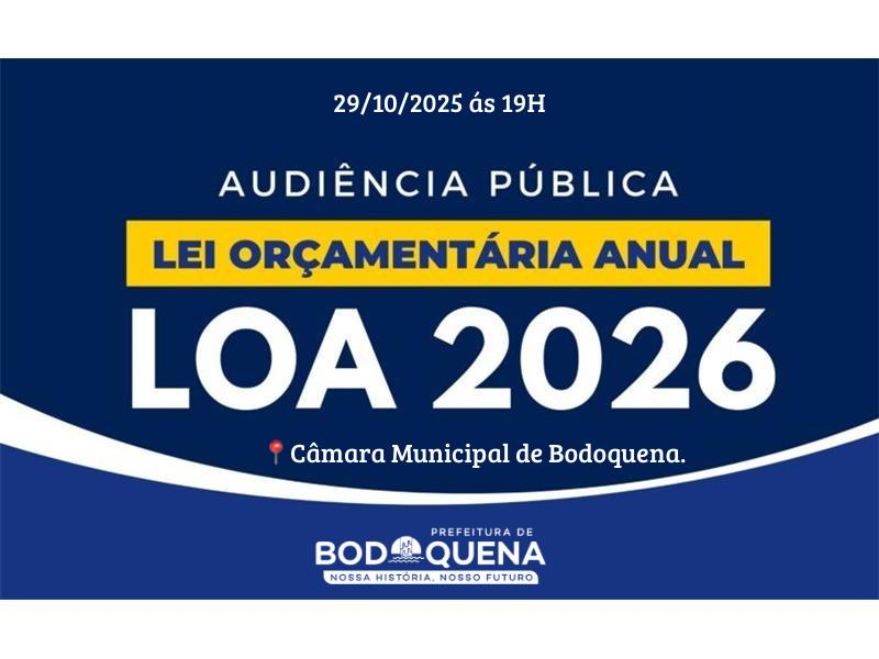 A Prefeitura de Bodoquena convida toda a população para participar da audiência pública sobre a Lei Orçamentária Anual (LOA) para o exercício de 2026. O encontro será realizado nesta quarta-feira, dia 29 de outubro, às 19h, na Câmara Municipal.